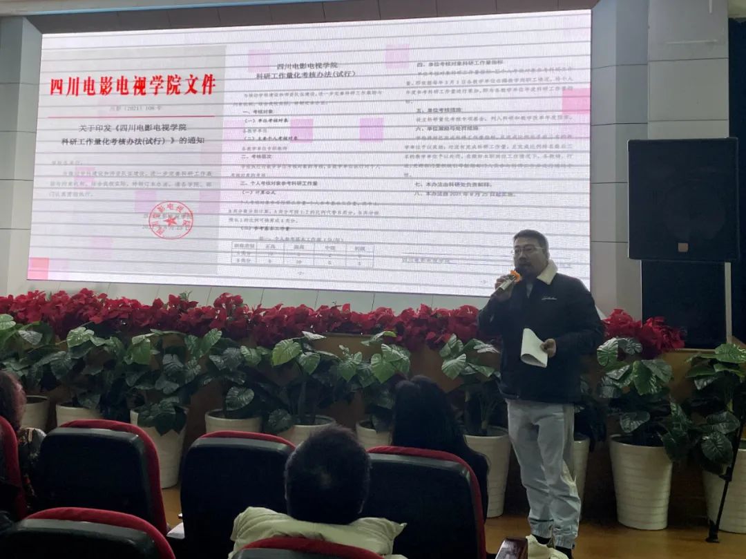 会议最后,播音主持学院副院长周欣副教授对学院2022年科研工作考核情况进行了总结,并强调了学院新学期科研工作的相关新举措和新要求,就2023年度项目结题、项目申报、奖励措施、发表论文等相关科研指标进行一一落实,他要求教师要潜心做好科研,聚焦一流专业建设点建设工作,凝练研究方向,打造优势研究团队,推出高质量的研究成果,确保各项指标能如期高效完成。同时,周欣副院长也对学院2023届毕业设计工作和实验室安全工作进行了安排部署。