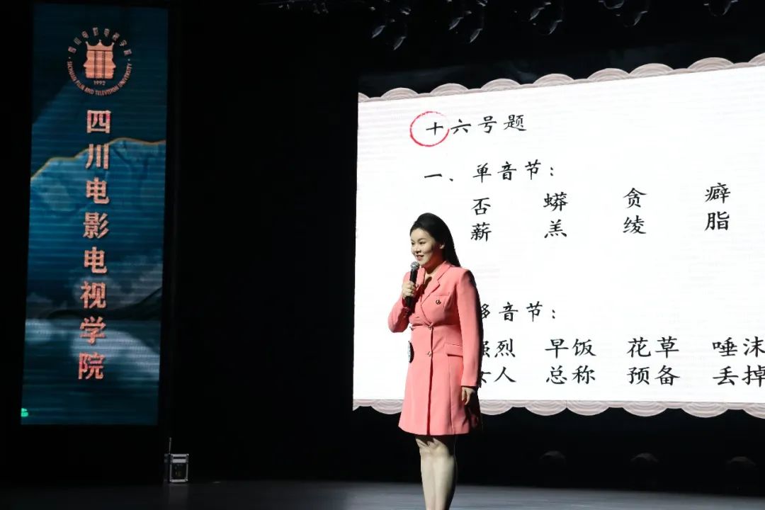 这一环节紧密结合了同学们在大一期间的所学内容。比赛期间,选手们随机选取题目,进行单音节字及多音节词语辩读。16套题目中包含了一些难点字词,在展现选手们语音面貌的同时,也考察了他们平时的个人积累。