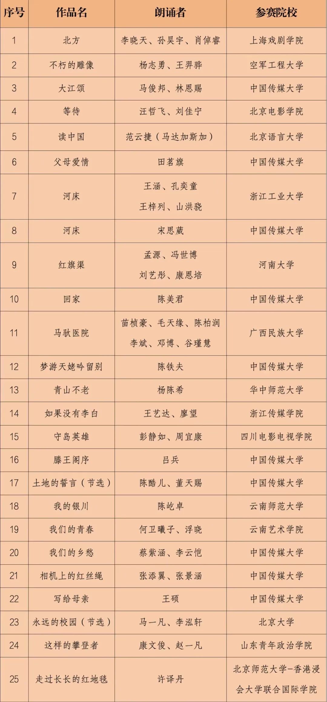 11月14日、15日,齐越朗诵艺术节暨全国大学生朗诵大会复选展开。经评委会评审,最终有25部作品从100部复选作品中脱颖而出,进入终选环节。《守岛英雄》也是其中一部。