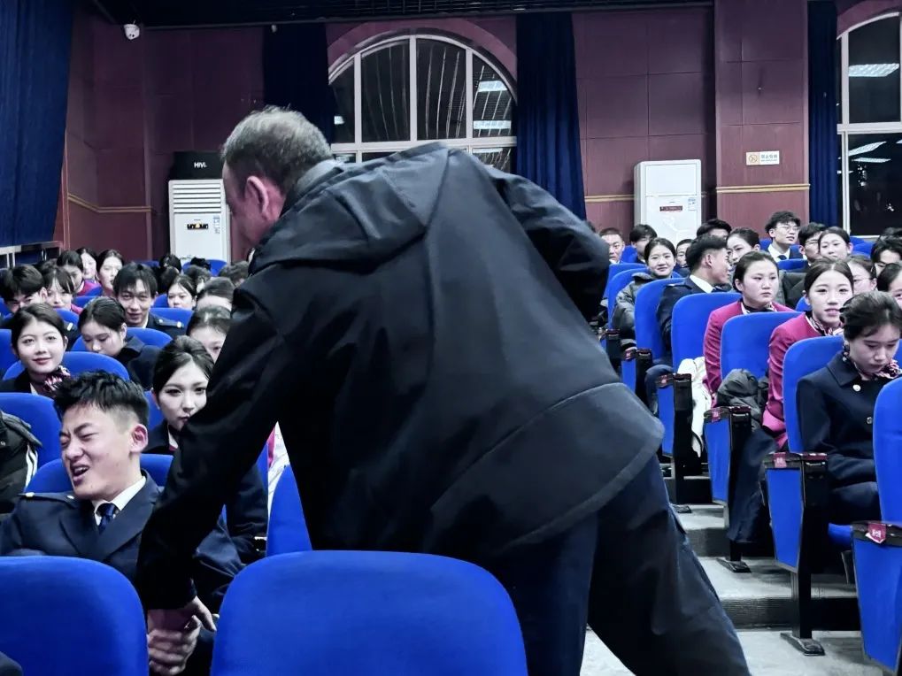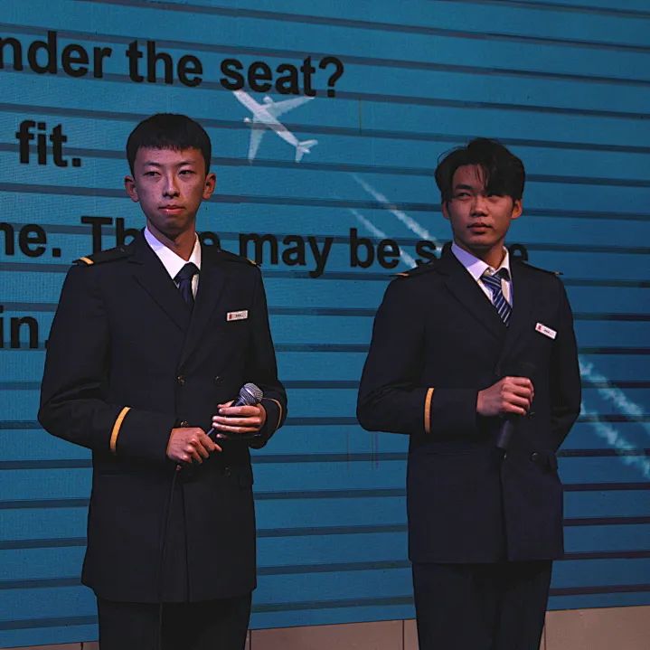 随后展示的班级,是22级航空服务艺术与管理1班。本轮展示环节中,同学们两人一组,分别扮演乘客及乘务人员进行“英语情景对话”。展示的话题贴近生活,是乘务人员工作情景的真实再现。同学们的英语不仅流利,同时拥有良好的情感表现,体现出乘务人员对旅客的人文关怀。