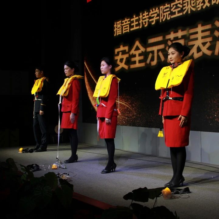 首先上场的是22级空中乘务2班的同学们。本轮测评,采用大屏幕抽签的方式,随机选取四名同学进行“安全示范表演”的专业展示。通过现场道具及录音播放,生动地再现航班工作中真实情景。而随后的“综合问答”环节也彰显了“理论与实践相结合才能更好地进步”这个永恒的道理。