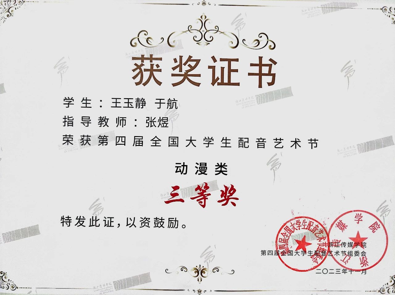 2022级播主4班杨涛祺荣获动漫组提名奖