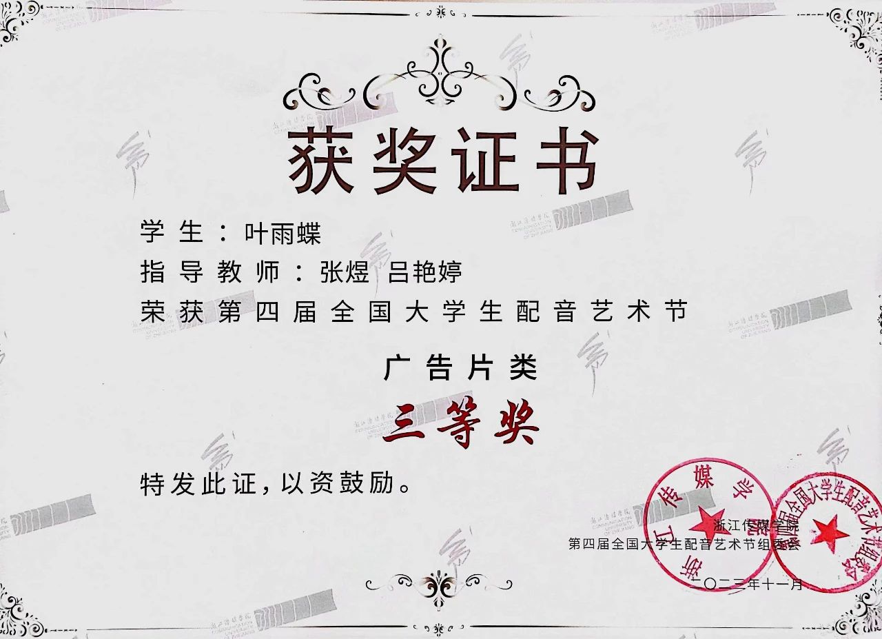 2021级播主6班叶雨蝶荣获广告片三等奖