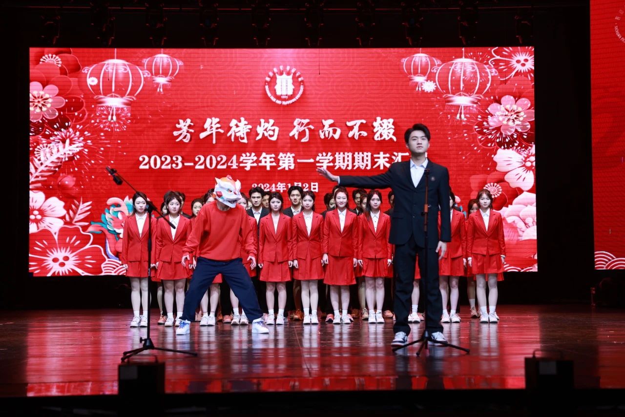 汇报会开始,各班依次上台,将古诗词、绕口令和贯口以充满创意的形式串联起来,展示出了各班本学期的专业学习成果及精神风貌。