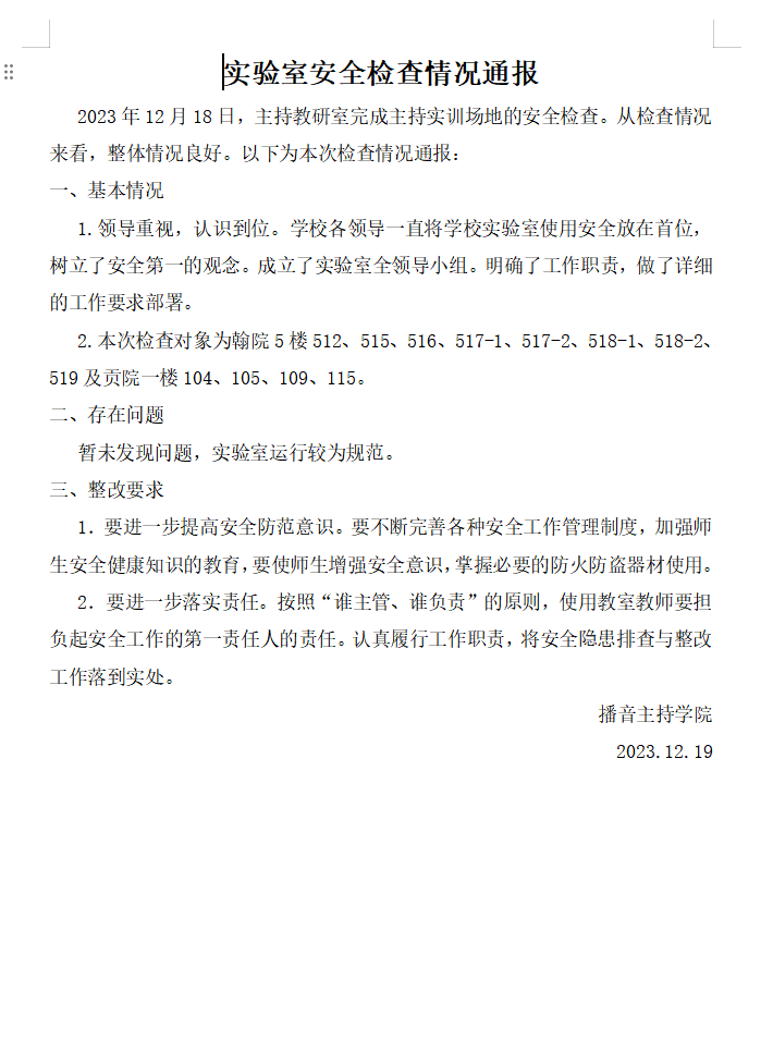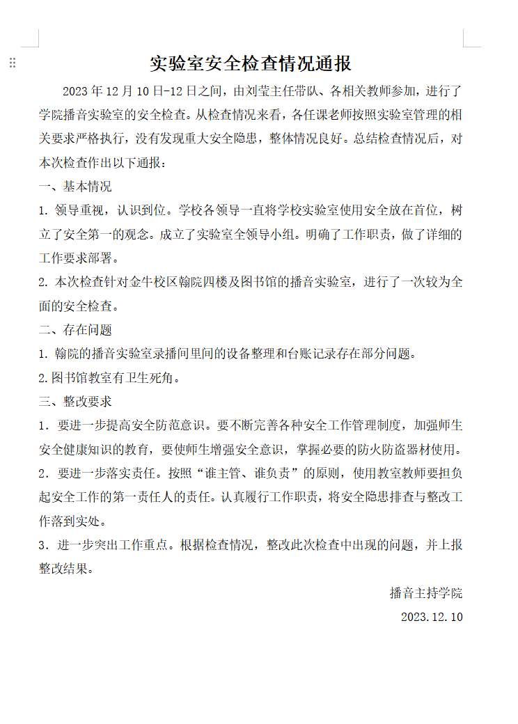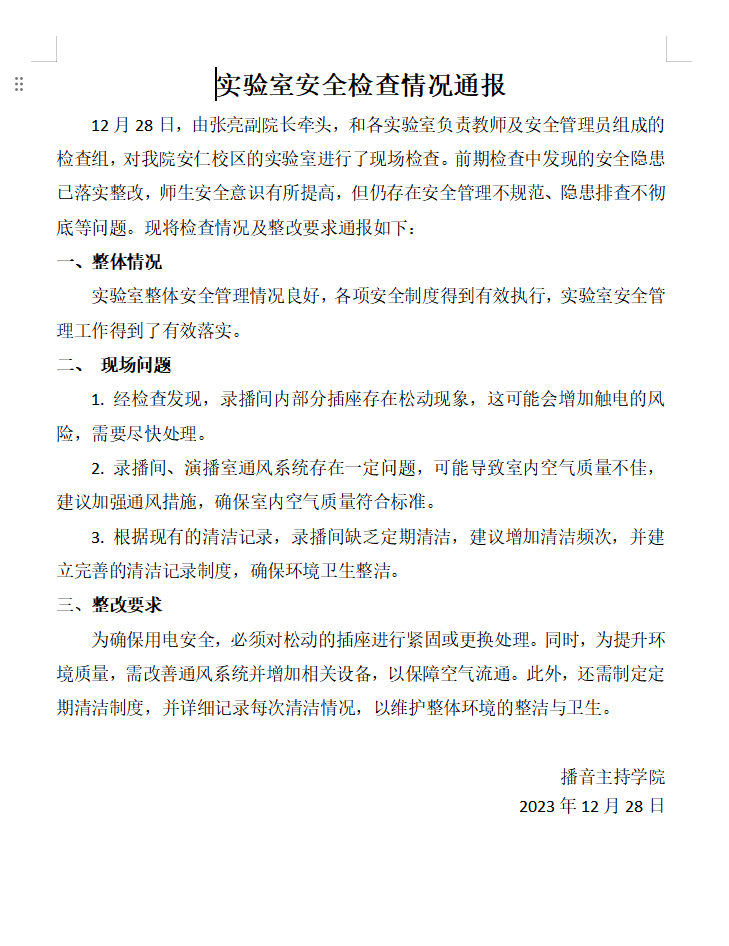 2023年12月实验室安全检查情况通报