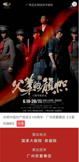 芭蕾舞剧《旗帜》是一部以讴歌党、讴歌祖国、讴歌人民、讴歌英雄为创作主旨的红色题材舞台艺术年度力作。深刻弘扬了流淌在华夏儿女血脉里的爱国主义情操。1927年12月,震惊中外的广州起义爆发了,它第一次公开打出“工农红军”旗号,建立起中国第一个城市苏维埃政府——广州苏维埃政府,在中国革命由危机实现向土地革命的转变中发挥了重要的历史作用。广州起义同南昌起义、秋收起义一起开创了中国共产党创建红军、独立领导革命战争的新纪元,在中国人民革命斗争史上写下了光辉的一页。全剧以革命先烈们战斗的青春、悲壮的牺牲为主线,将现时的目光投向史实,运用时空交错的艺术手法,以最直接有力的方式呈现剧中的人物情感和戏剧矛盾,立体细致地展现了中华儿女爱党爱国的胸襟与情怀。全剧充满昂扬的激情,但又不乏历史的深邃与沉重,那流淌在华夏儿女血脉里的爱国主义情操,必将为新时代注入强大精神动力!