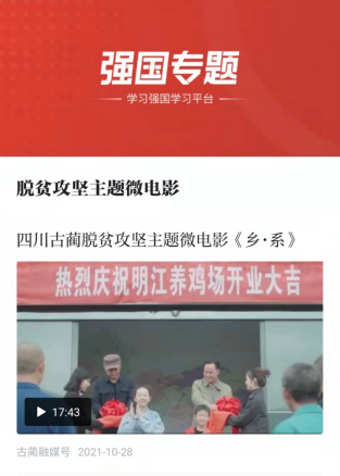 前不久,由电视学院2018级广编三班的刘林喆、周觅、张妍秋、韩淼等同学合作拍摄的古蔺政府脱贫攻坚主题微电影《乡·系》,由古蔺融媒号发布登录学习强国平台中强国专题。