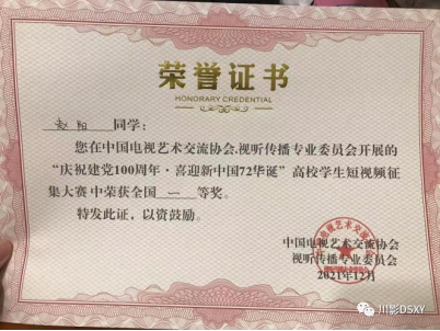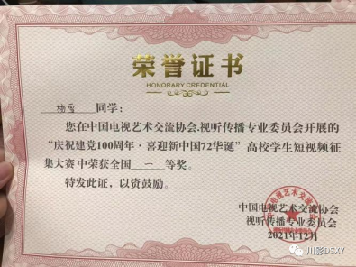 多名同学在京视沐书课程老师的指导下,积极参加中国电视艺术交流协会 视听传播专业委员会开展的建党100周年/喜迎新中国72华诞短视频大赛,荣获全国一等奖、全国二等奖。