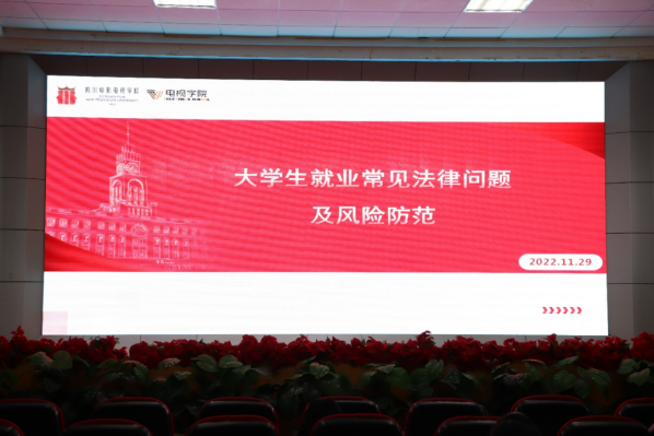 为增强大学生就业法律意识,防范就业实习风险,11月29日下午,大学生就业常见法律问题及风险防范讲座在金牛校区第一学术报告厅举行,本次讲座由学校招生就业处、四川省人力资源服务行业协会职业培训专委会联合主办,电视学院、播音主持学院承办,学校招生就业处副处长傅赟及部分师生到场参加。