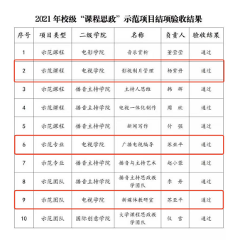 根据《beat365平台官方网站关于开展2021年校级“课程思政”示范项目结项工作的通知》(川影教〔2022〕49号)要求,学校对2021年立项建设的校级“课程思政”示范项目进行结项验收,经学校初审、学校评审,电视学院3个项目通过验收。