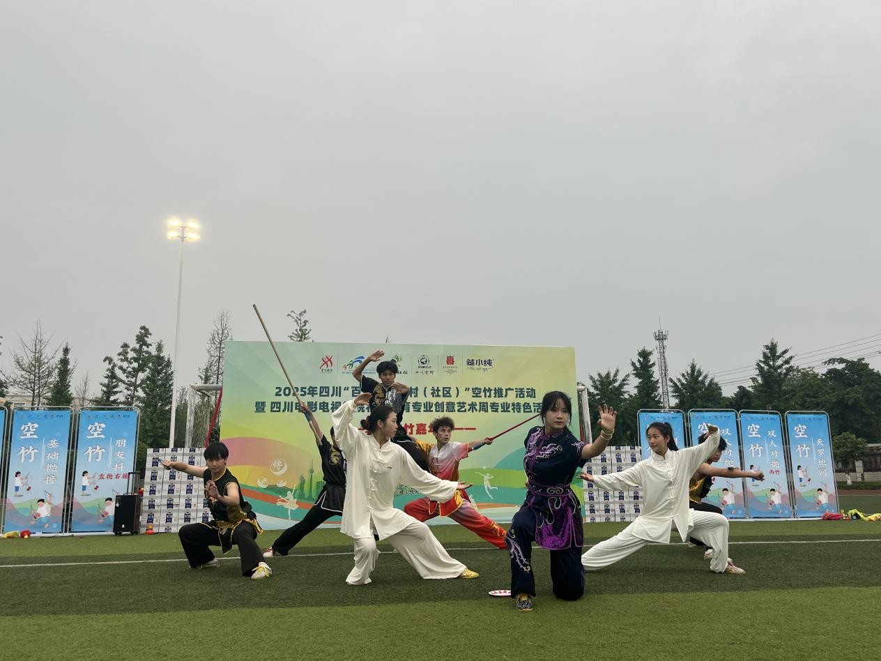 活动在川影舞狮队、武术队的精彩表演中拉开帷幕,锣鼓喧天中,舞狮灵动跳跃,点燃全场热情。随后,社会体育专业学生赵京城带来空竹节目《炫影竹韵》,只见空竹在他手中上下翻飞,配合行云流水的肢体动作,演绎出“银球翻飞抖古韵”的东方美学。双流区空竹表演队的集体节目《中国美》更是将现场气氛推向高潮,队员们以“双人对抛”“天罗地网”等高难度技巧,展现空竹运动的团队协作魅力,赢得阵阵掌声。