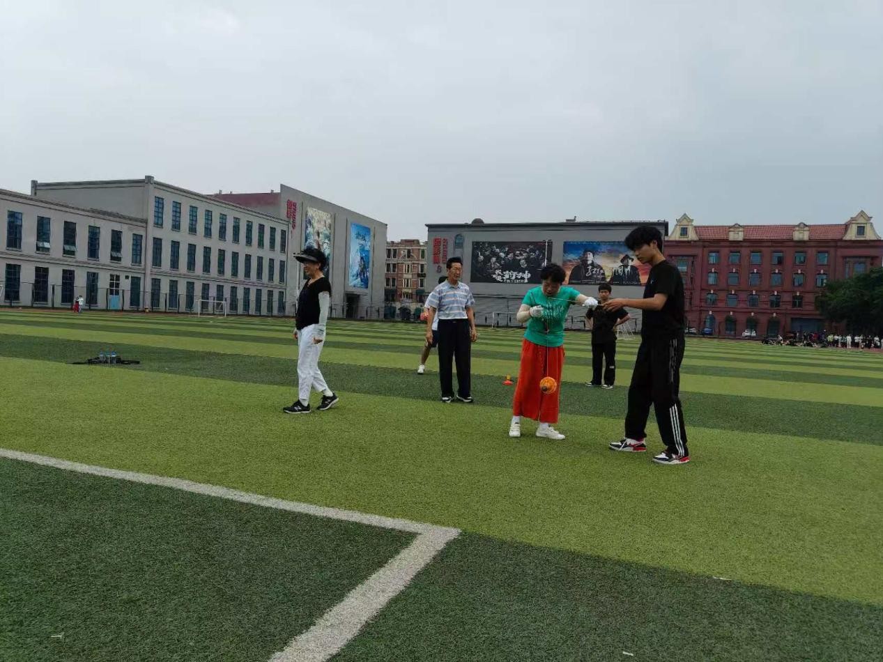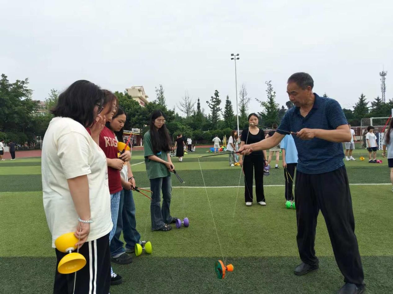 活动特别邀请空竹表演队前辈及成都外国语学校附属小学向靖老师,对社会体育专业学生进行现场指导。从空竹的基础握法到高难度抛接技巧,行业专家结合多年经验言传身教,推动课堂教学与实践应用的深度融合。这种“展演 + 实训”的模式,让我们在真实场景中提升专业技能,也更直观地理解非遗传承的意义。