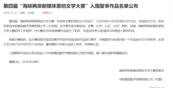 第四届“海峡两岸新媒体原创文学大赛”入围复审作品名单公布