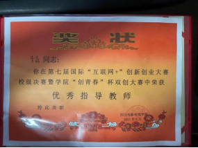 (1) 第七届国际“互联网+”创新创业大赛校级决赛暨学院“创青春”杯双创大赛荣获优秀指导教师奖(图3.1)