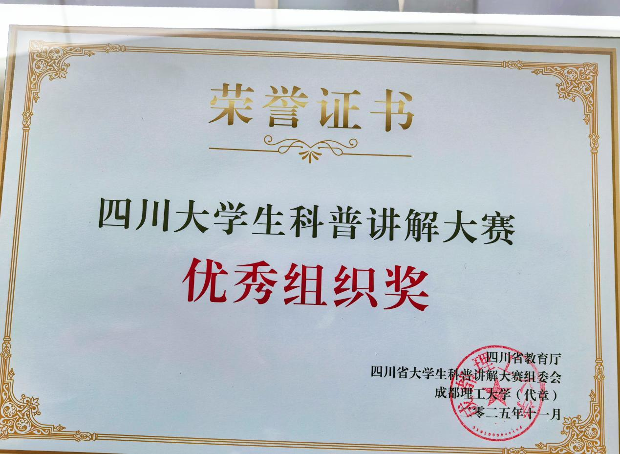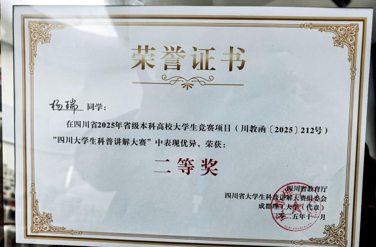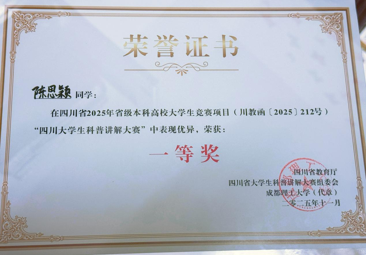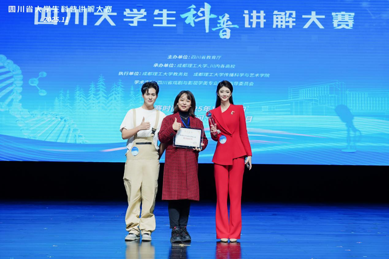 四川大学生科普讲解大赛"于11月27日在成都理工大学开赛,由省教育厅主办,聚焦科普知识传播与大学生能力提升。beat365平台官方网站播音主持学院推荐2名学生参加决赛,在全省21所院校,43名选手中,通过自选讲解、命题讲解、评委提问三项综合考核中表现出色,陈思颖获得一等奖、杨瑞获得二等奖(且名次靠前),同时根据大赛文件说明,获得一等奖的指导教师任云芳、赵小蓉、李丹也同时获得优秀指导教师荣誉。
