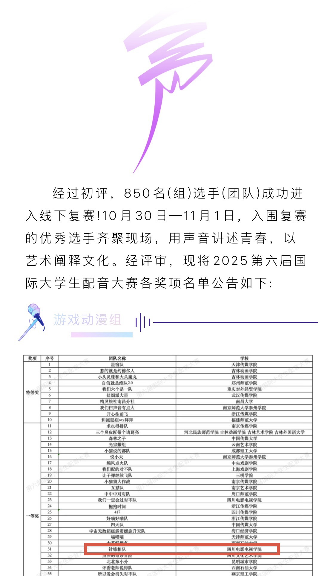在第六届国际大学生配音大赛中,我校代表队凭借出色表现荣获游戏动漫组一等奖。本次赛事汇聚了全球高校的配音精英,赛程紧凑、竞争激烈,对选手的即兴创作与团队协作能力提出了极高要求。在曹飞老师的专业指导下,董博洋、冯瑞祥、申子晨、刘双铭、闫妍、陶奕六位同学组成的“针锋相队”克服备战时间紧张的压力,通过密集排练与精准磨合,最终以富有张力的声音演绎和高度契合的角色塑造征服评委。此次获奖不仅展现了我校学子的专业素养,更体现了师生在高压环境下追求卓越的拼搏精神。