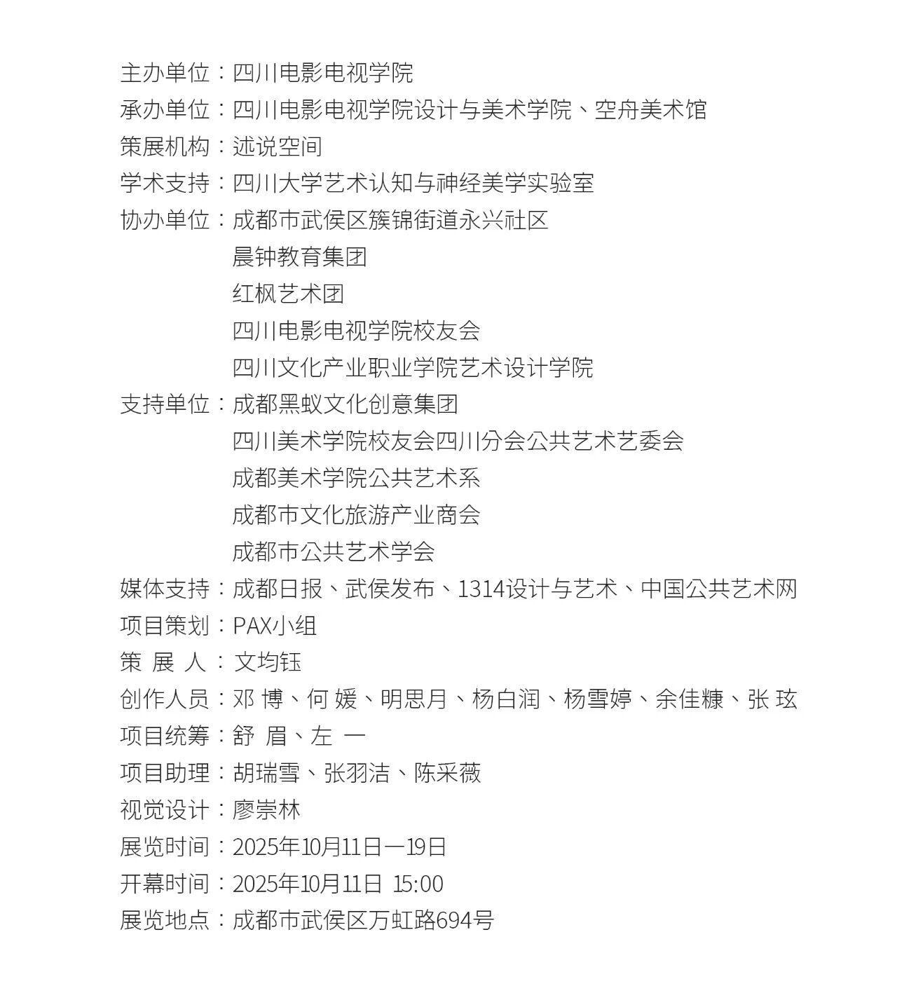 成都已然成为全国社区营造、城市更新的典范城市。悠久的历史、丰富的市井文化、大众生活态度和城市包容性为文化实验提供土壤,为公共艺术走进社区和日常提供条件.正如本次展览“混响场:簇锦街道社区再叙事”,以“公共艺术如何激活社区记忆与文化想象”为核心议题,将时间化为线索,勾连起簇锦社区从秦汉历史脉络到当代生活语境的发展轨迹。