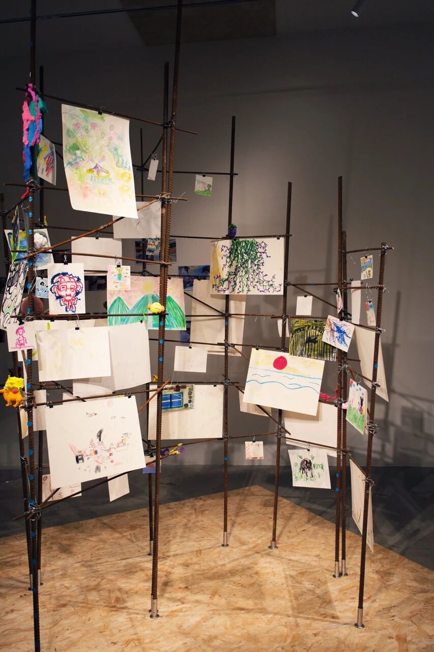 《田器谜》聚焦于改革开放前的农耕记忆。四川传统农具的意象被不同年代的记忆和认知重新定义,通过社区工作坊,时代的变迁在孩子们的笔下,用图形和颜色描绘。在他们的绘制与改造中,工具转化为符号化的图像,重构出介于记忆与幻想之间的形态。最终,这些“再造的农具”汇聚为一件光影装置,超越了物件本身,成为代际对话的媒介--在童真的创造力与集体记忆的交汇处,农耕文化获得新的可见性。