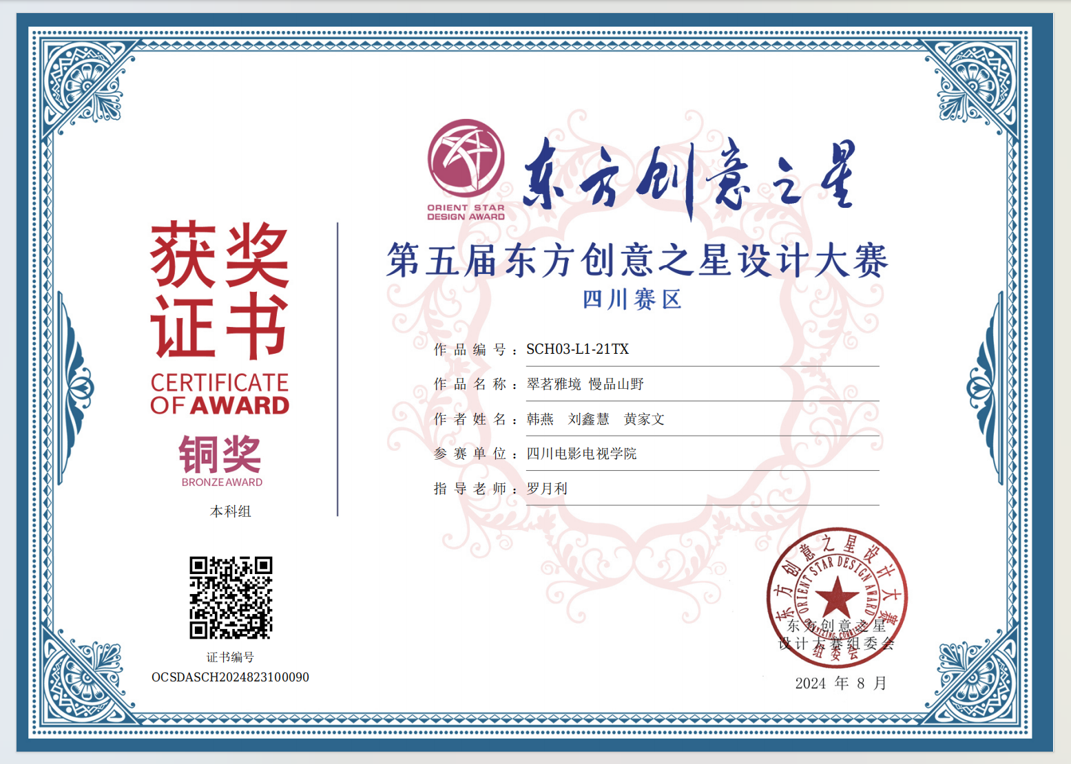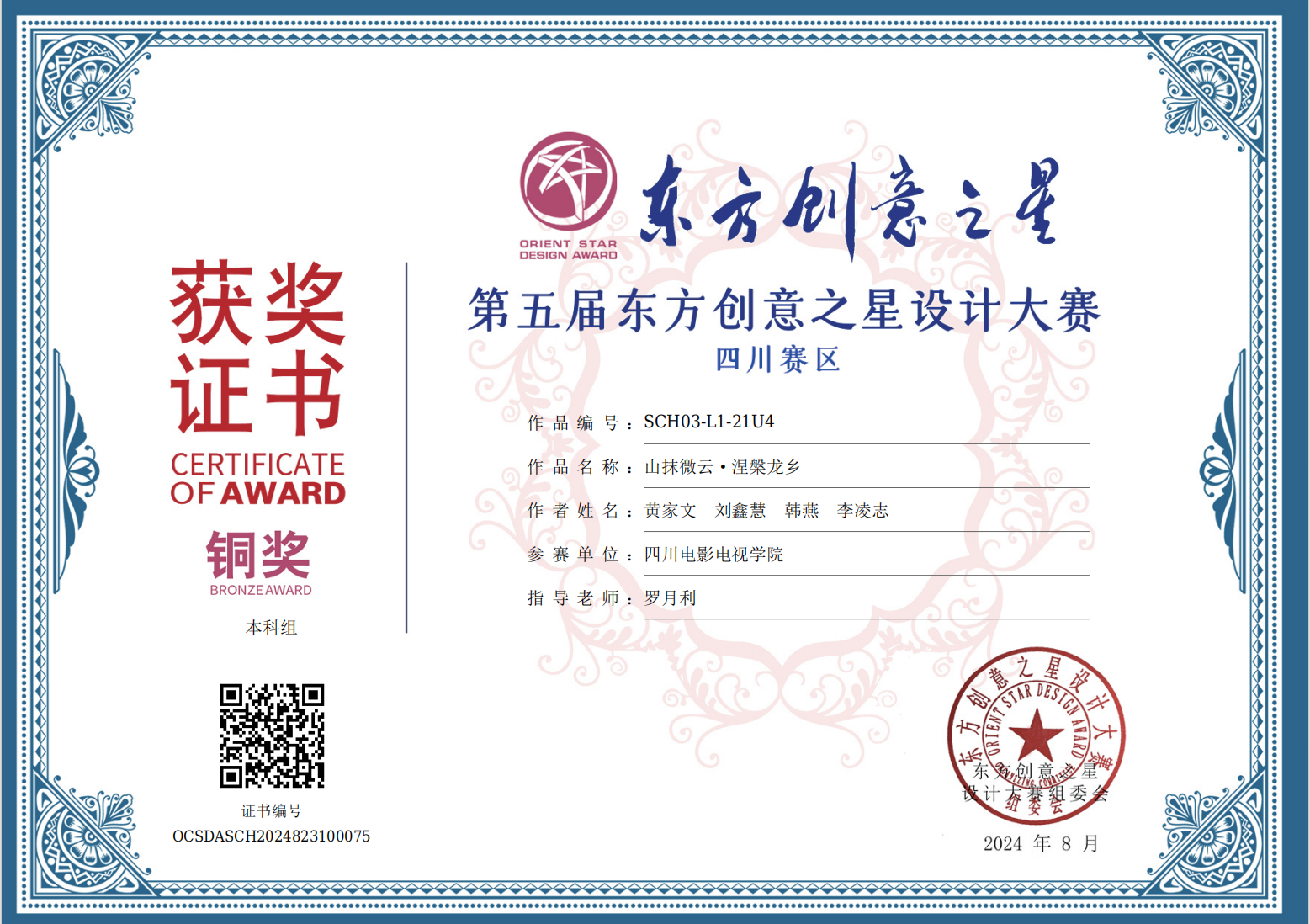2024年8月第五届东方创意之星设计大赛 铜奖 黄家文 韩燕 刘鑫慧 李凌志 23级 公共艺术3班S《山抹微云 涅槃龙乡》