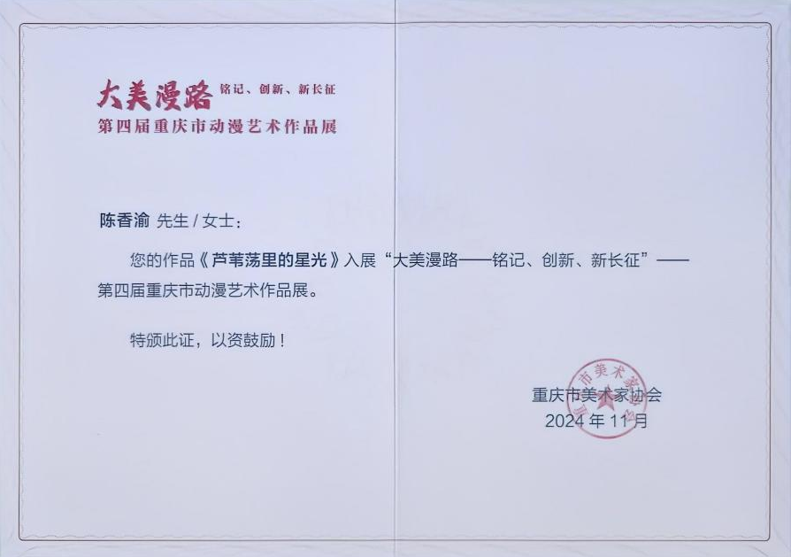 作品《合川老人动画场景》入选2022中国西部动漫文化节暨“大美漫路”重庆市动漫艺术作品展。作品《如愿》参展“丝路遗产·数字活化科技艺术展2022年(第二季)”。