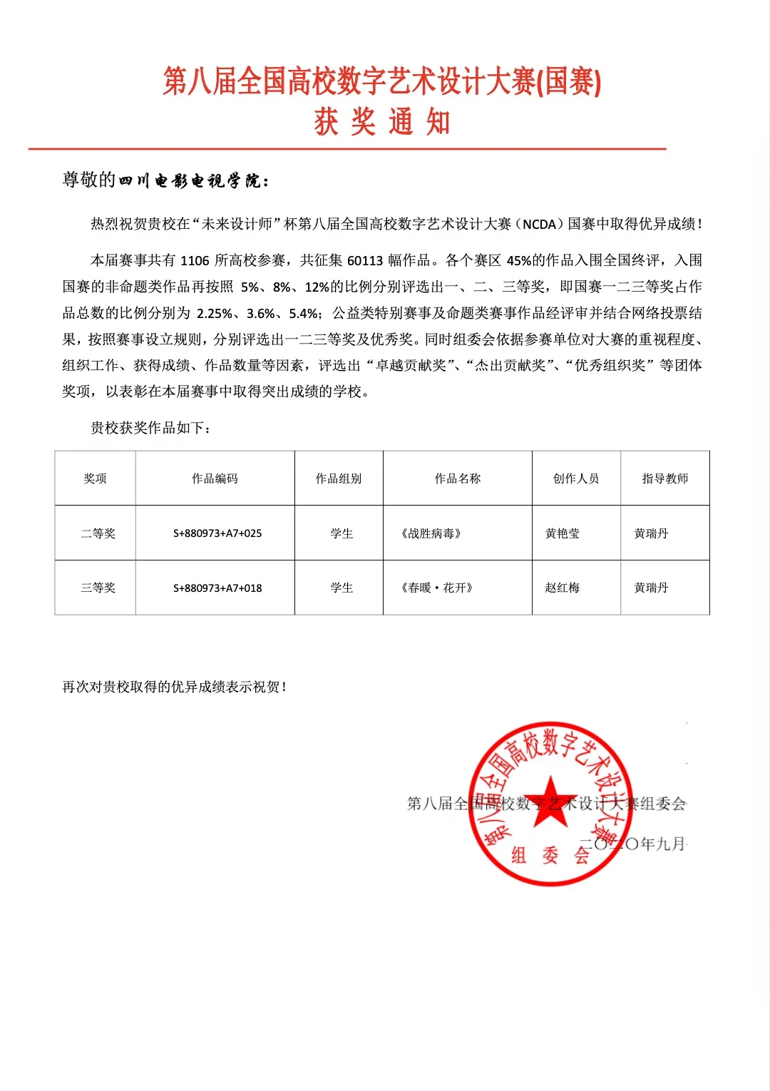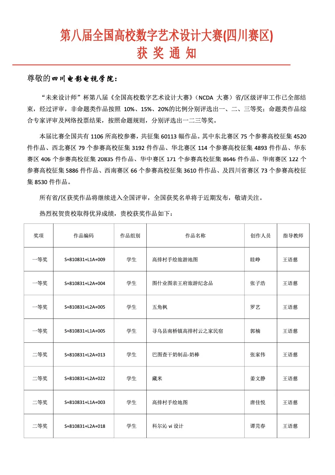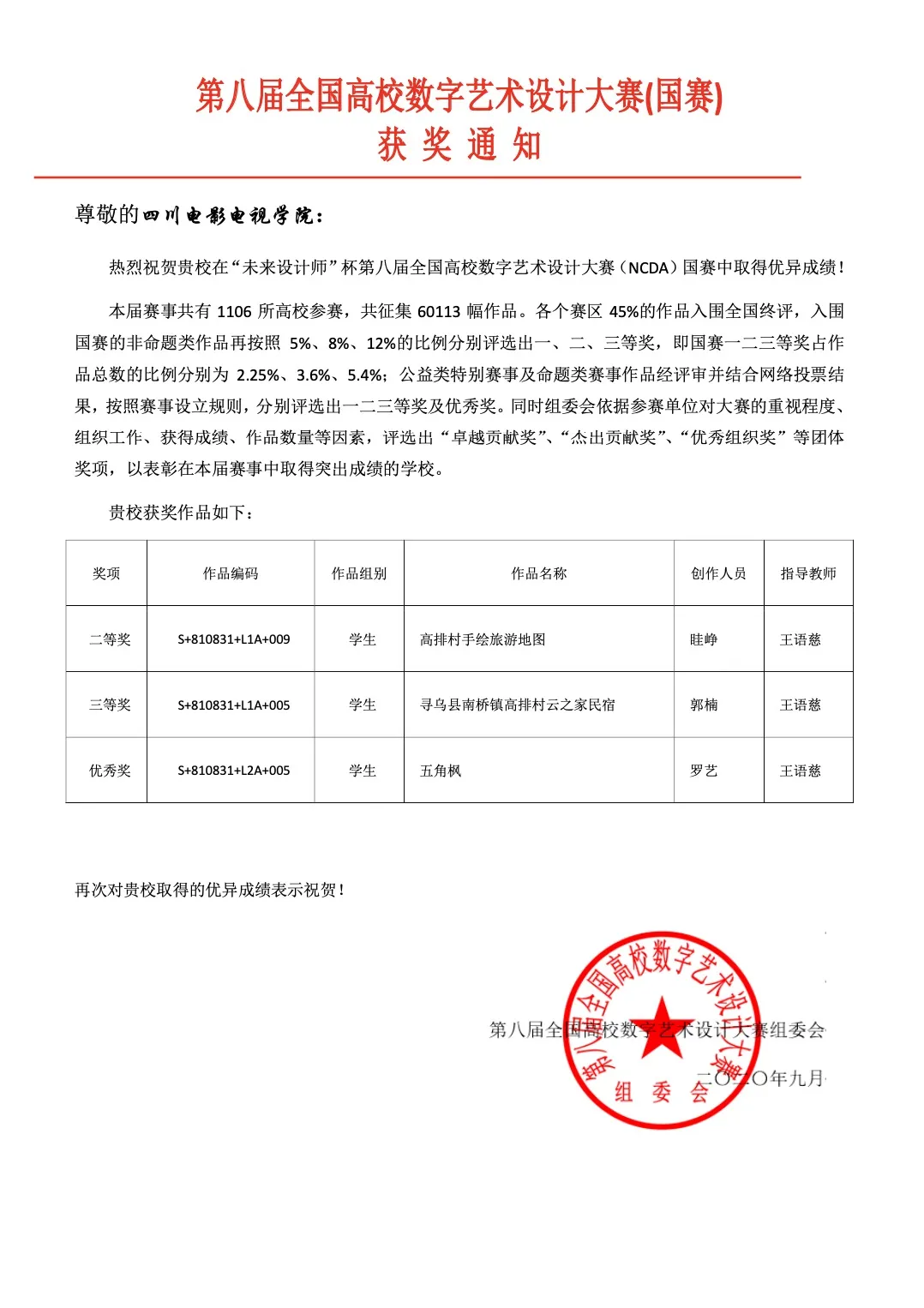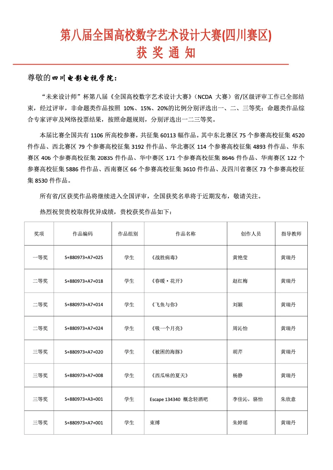 近日,第八届全国高校数字艺术设计大赛(NCDA)国赛评审结果揭晓。beat365平台官方网站设计与美术学院学生作品喜获全国二等奖2项、全国三等奖2项、全国优秀奖1项;另获得四川赛区一等奖5项、二等奖12项、三等奖12项,奖项总计34件次,作品参赛量、获奖量位居全国同类高校前列。