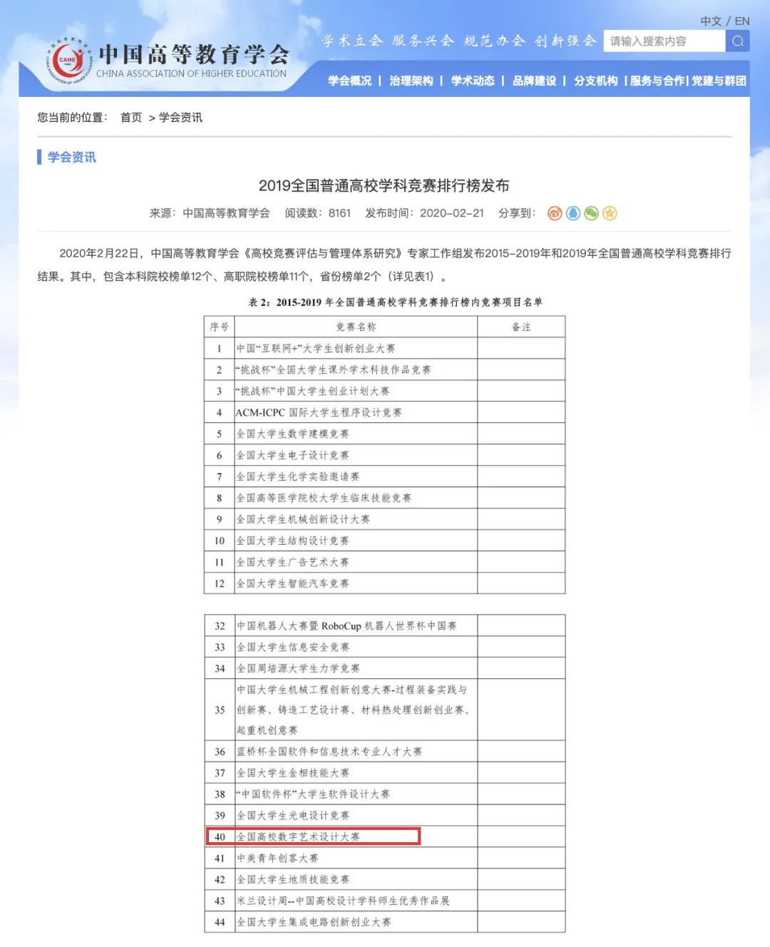 据悉,全国高校数字艺术设计大赛是由工业和信息化部指导、人才交流中心连续8届主办的全国性数字创意艺术专业赛事,具有广泛影响力和权威性,是一项高规格、高水平的学科竞赛。该赛事已纳入教育部、中国高等教育学会《高校竞赛评估与管理体系研究》专家组发布的《全国普通高校学科竞赛排行榜》,是普通本科高校教育教学质量评价体系的34项全国性竞赛项目之一,是观测高校教育教学改革和创新人才培养质量的参考之一。
