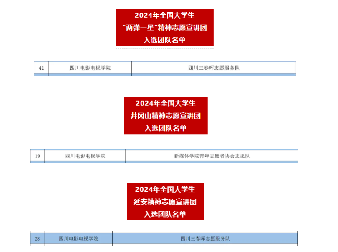 近日,团中央青年志愿者行动指导中心联合多部门发布了《关于遴选2024年全国大学生井冈山精神志愿宣讲团的公告》、《关于遴选2024年全国大学生延安精神志愿宣讲团的公告》、《关于遴选2024年全国大学生“两弹一星”精神志愿宣讲团的公告》,新媒体学院青年志愿者协会、三春晖志愿服务团队积极申报,并成功入选2024年全国大学生井冈山精神志愿宣讲团、2024年全国大学生延安精神志愿宣讲团、2024年全国大学生“两弹一星”精神志愿宣讲团。