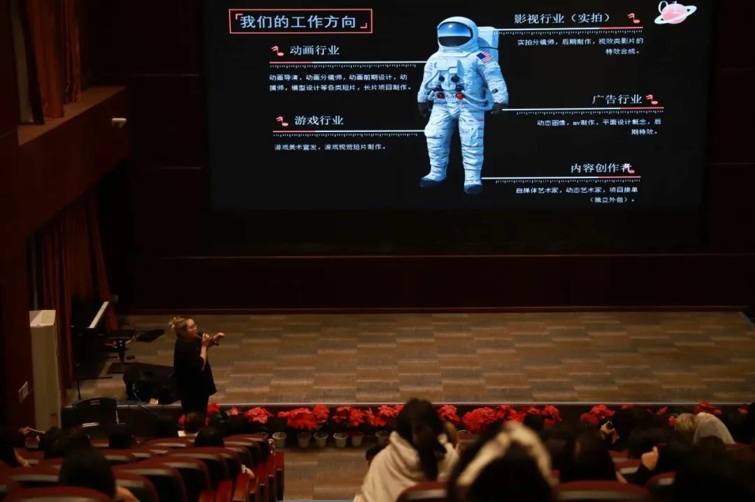 4月22日下午,动画专业分方向专题会议在红厅举行。王月主任介绍了动画专业的三大方向:影视动画、漫画与插画、游戏美术创意与设计,并展示了各自的核心课程。