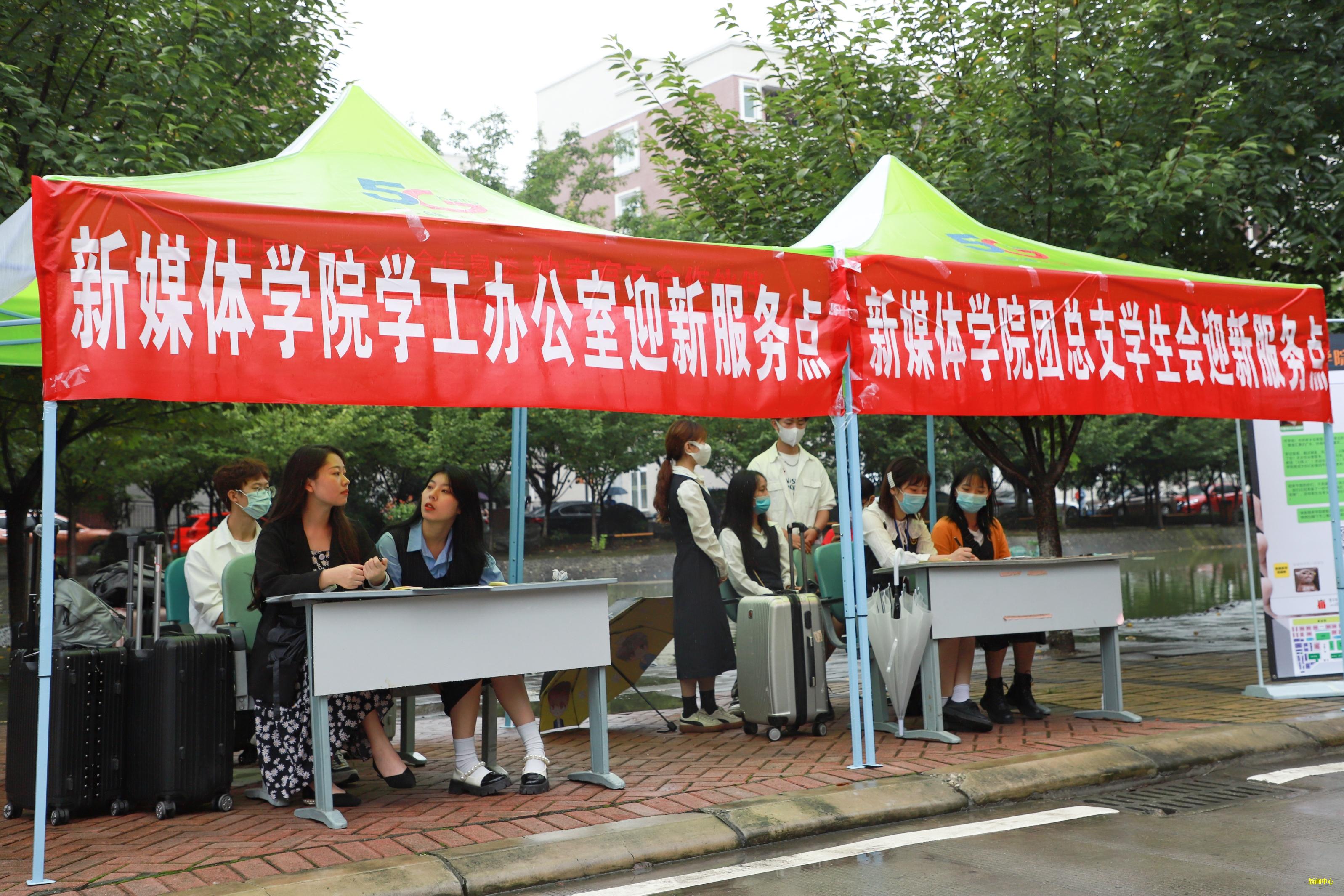 新媒体学院院长叶文林,新媒体学院直属党支部书记范琳琳一同检查迎新情况