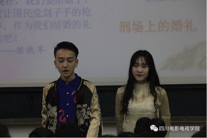 随后,高中伟教授一行来到翰院314教室进行随堂听课。314教室内张代芬老师正在为16级表演一班讲授《中国共产党探索中国革命道路的艰辛历程》,张老师用生动的语言、丰富的表情、饱满的激情为同学们讲述那个历史时期波澜壮阔的场面。同学们听得津津有味。当讲到历史上著名的“刑场上的婚礼”时,两名同学走上讲台,扮演起了主人公周文雍和陈铁军,将那一幕感人场面生动地呈现给在场所有人,赢得了一片掌声。