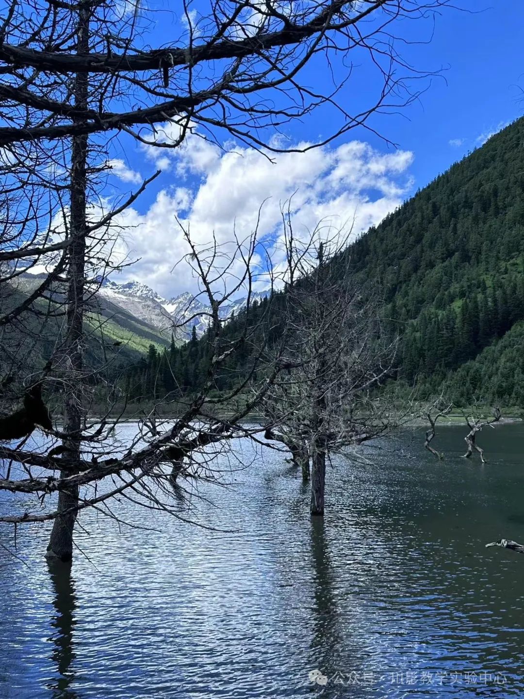 阳光穿过森林映下斑驳,风中的树叶摇曳生姿,小溪沿着石滩缓缓流淌,抬头便是巍峨的雪山。