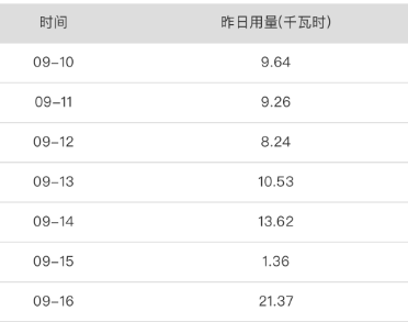 这种情况下可以根据房间多日用量情况来反向验证。如下面截图电表从9月10日开始到9月14日的用量,每日都在10度左右,所以14日到16日两天的用量在合计21度左右也是正常范围。
