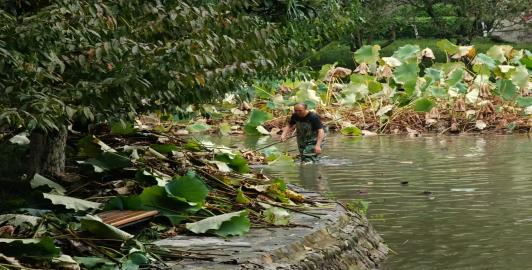 每年的10月份华严湖里荷花慢慢休眠过冬,湖面上荷叶开始枯萎,为持续加强我校环境卫生整治,营造整洁、优美的校园环境,10月23日后勤基建处组织员工开展对湖面进行清理。