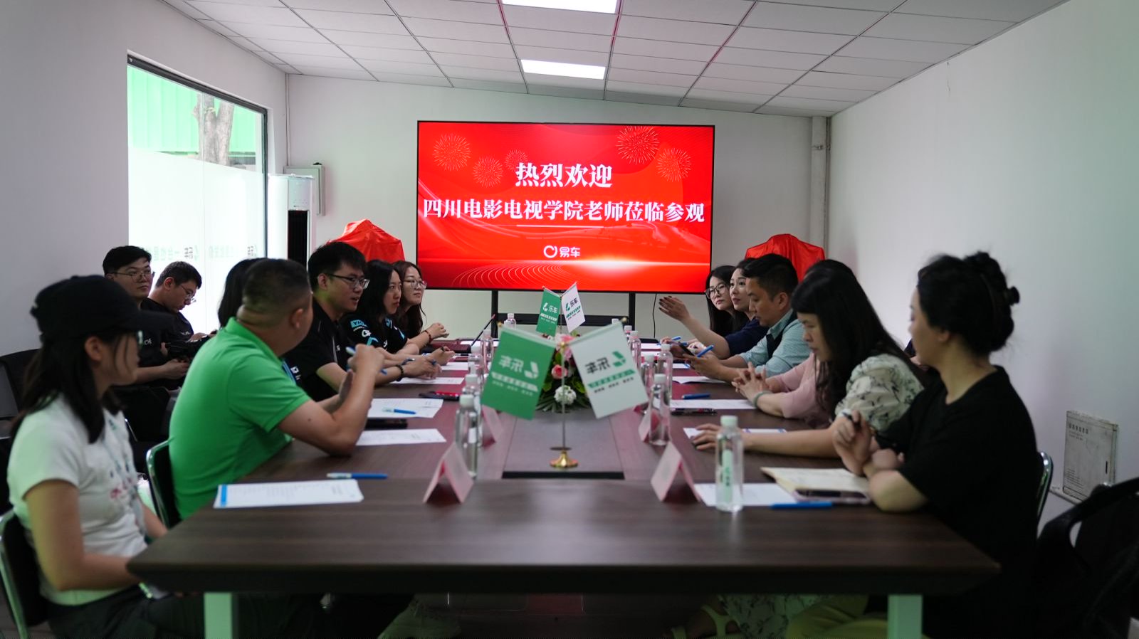 参观后校企双方移步会议室签约授牌,易车公司副总裁崔丽首先对川影嘉宾一行的到来表示热烈欢迎,并就公司的发展历程以及在蓉的产业布局、校企合作等内容进行介绍,基于前期合作沟通情况,进一步期望未来无车直播基地能够落地川影。