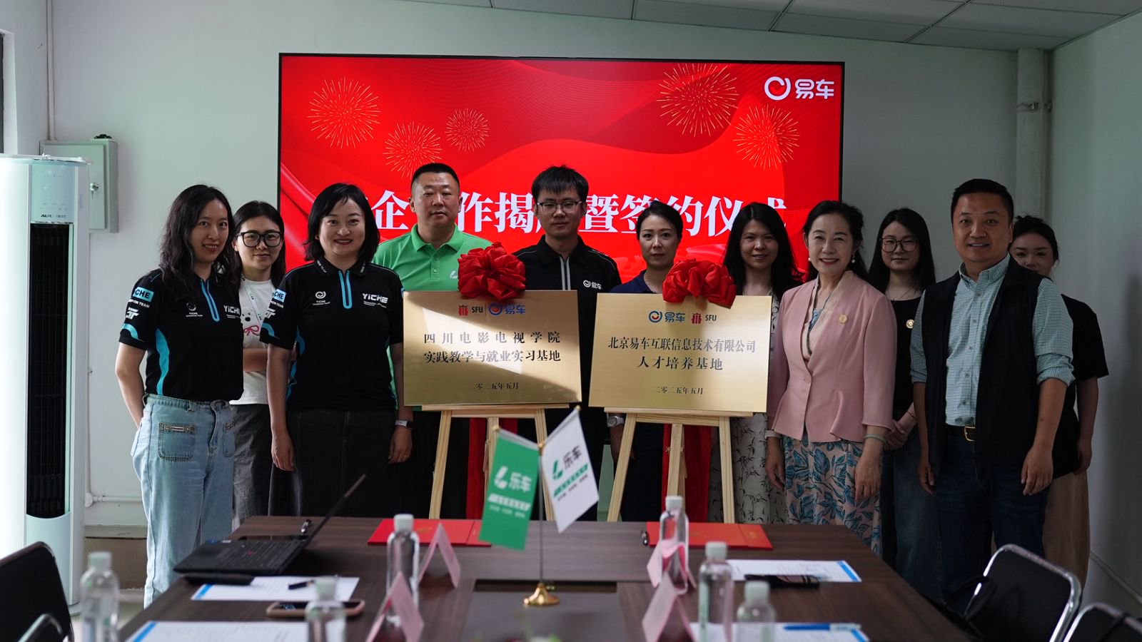 5月14日,易车与川影在乐车汽车超市直播基地举行校企合作签约暨揭牌仪式。学校校务委员、发展规划处处长黄萍,播音主持学院党委副书记、纪委书记张亮,新媒体学院党委副书记范琳琳,社会合作办副处长韩丽及相关工作人员出席仪式。