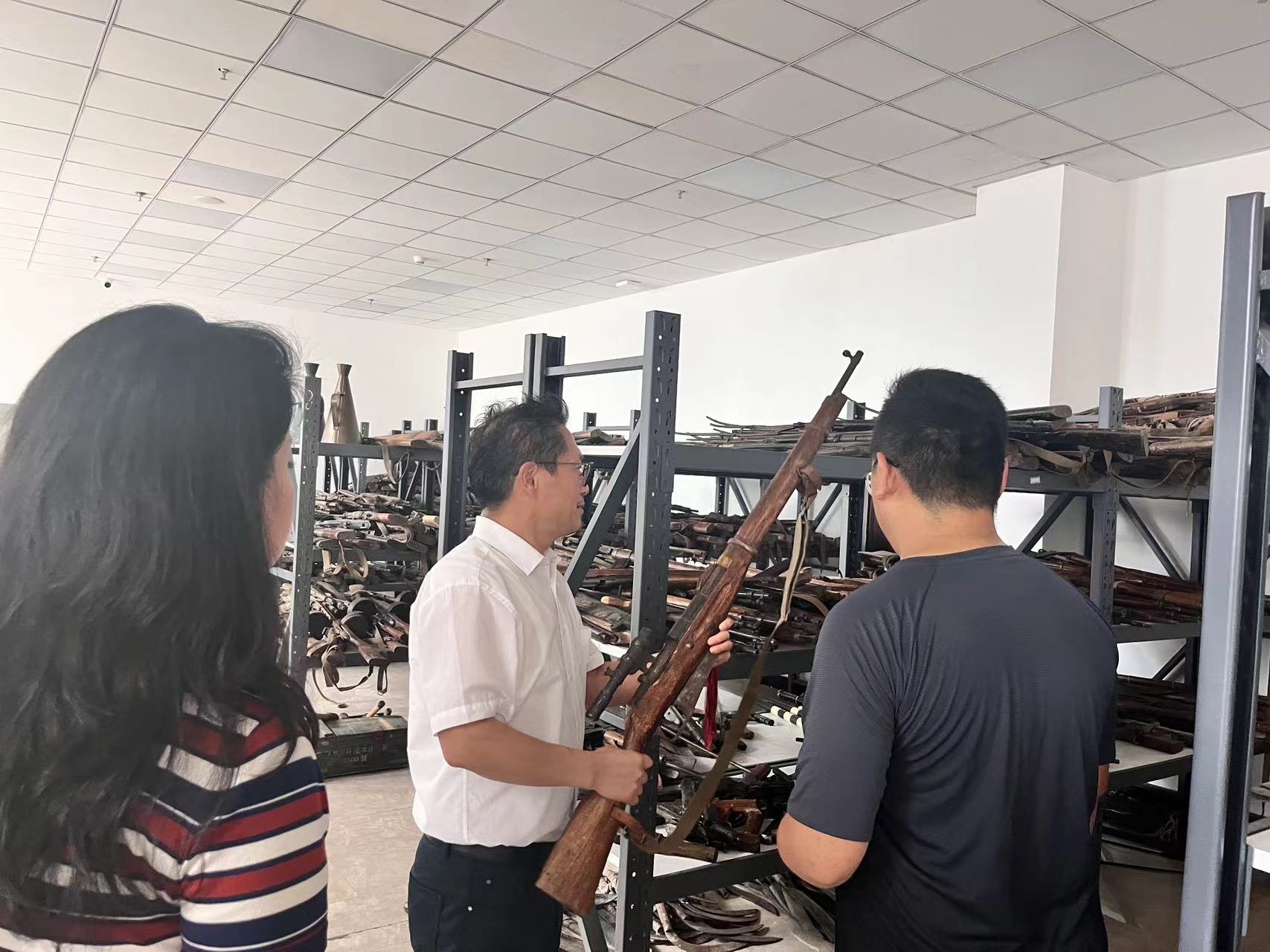 川影图书馆馆长王良超(中)为嘉宾介绍电影博物馆藏品