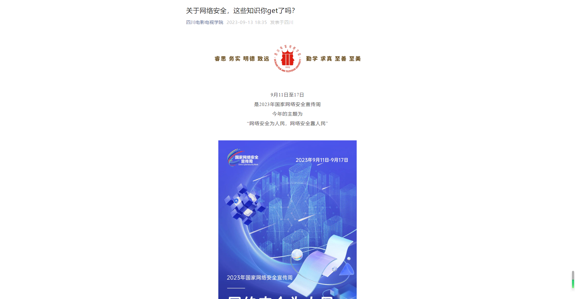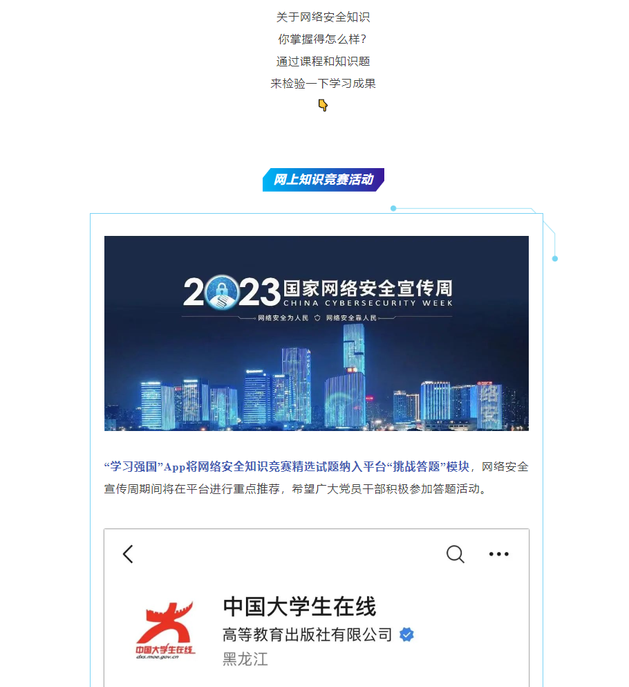 2023年国家网络安全宣传周于9月11日至17日统一开展,其中9月12日为校园日。今年的国家网络安全宣传周以“网络安全为人民,网络安全靠人民”为主题,我校通过网络安全教育讲座、网上知识竞赛等线上线下活动,着力提升广大师生网络安全意识和防护技能。