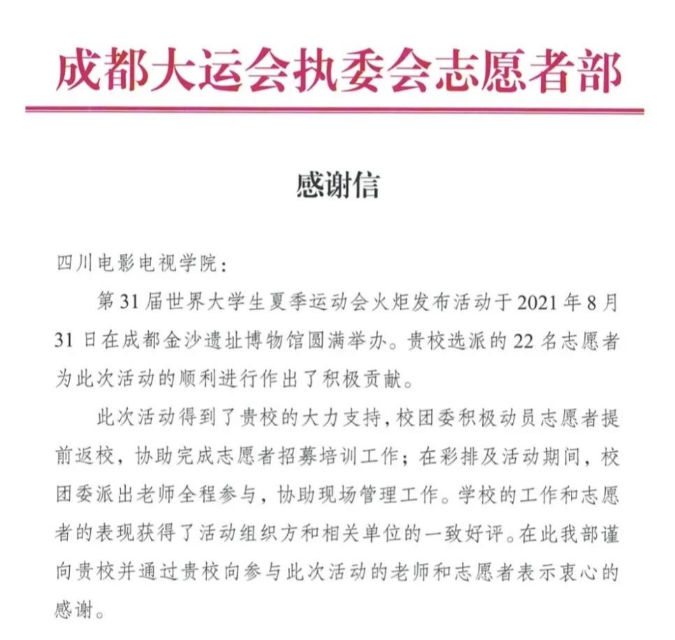 成都第31届世界大学生夏季运动会火炬“蓉火”,近日在成都金沙遗址博物馆正式对外发布。beat365平台官方网站56名志愿者参与发布仪式,担任礼仪、现场接待、活动指引等工作,积极贡献,展现青春活力,为此,成都大运会执委会志愿者部向我校发来了感谢信。