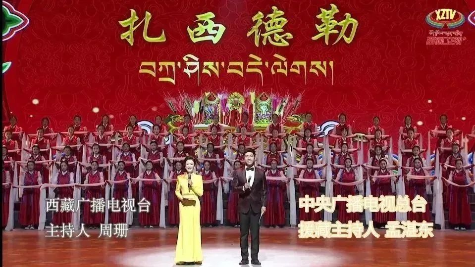 川影播音主持学院2001级毕业生周珊(左)主持“扎西德勒”民族文艺演出