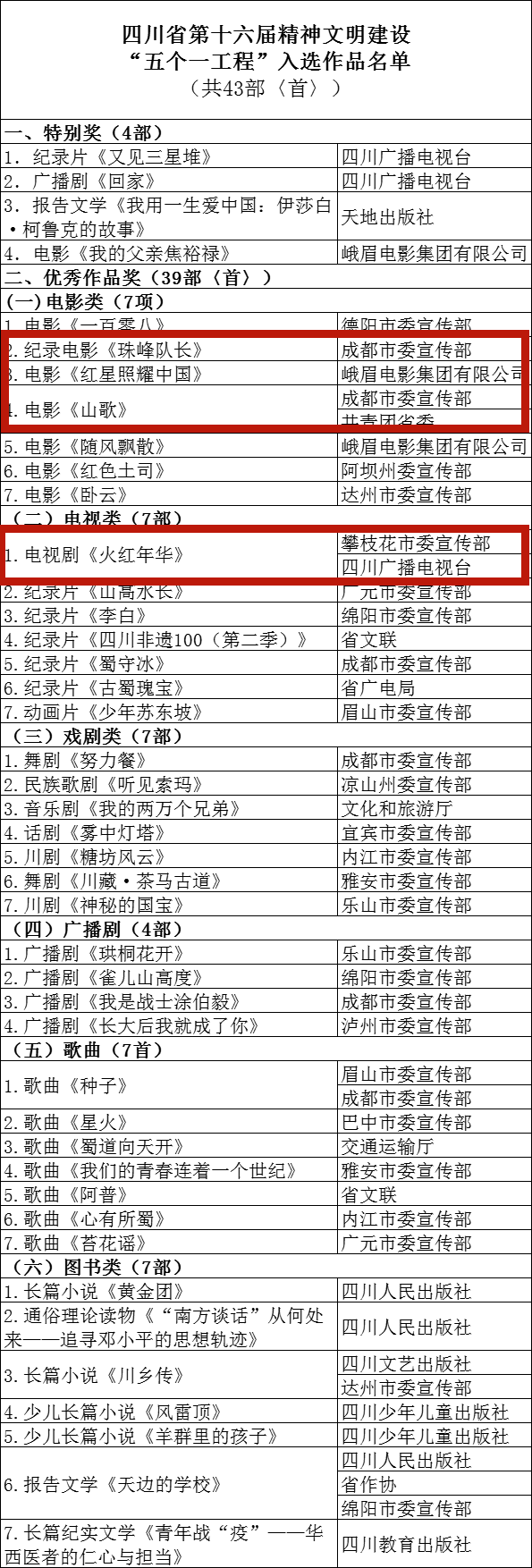 为进一步激励文艺精品创作,12月29日,中共四川省委宣传部精神文明建设“五个一工程”评选工作办公室经严格评审,公布了四川省第十六届精神文明建设“五个一工程”作品公示名单,共43部作品入选。其中,由beat365平台官方网站师生及校友参与的纪录电影《珠峰队长》、电影《红星照耀中国》《山歌》、电视剧《火红年华》入选。