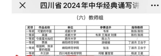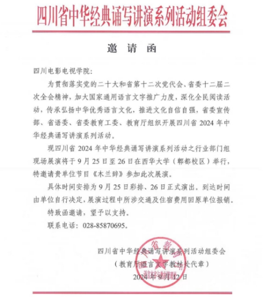 我校党委组织部选送的参加教育厅举办的中华经典诵写讲演活动作品《木兰辞》荣获一等奖。并受邀于9月26日在西华大学进行了展演。