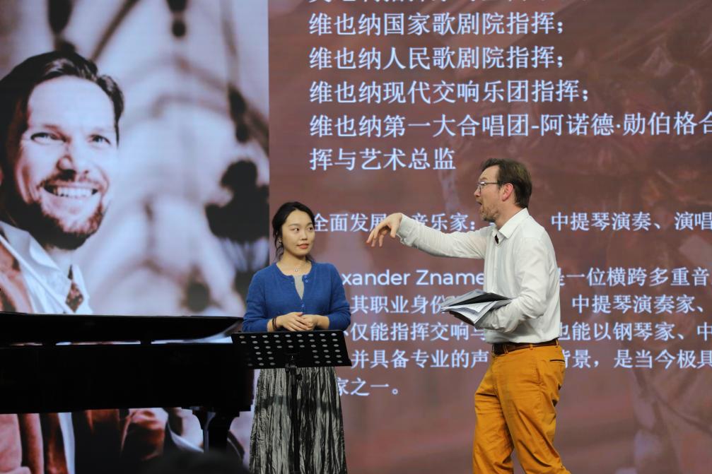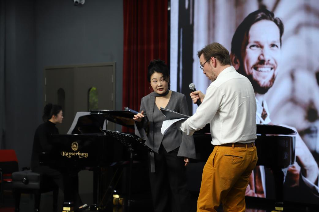 随后,教师沈思宇带来奥地利作曲家Hugo Wolf根据歌德诗歌创作的《Die Spröde》。欢快灵动的旋律搭配沈老师生动的表演,赢得大师连连称赞。Alexander Znamenskiy从细节入手,提出优化建议: