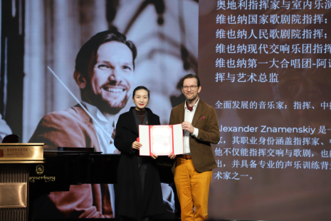活动伊始,我院为奥地利指挥家、室内乐演奏家 Alexander Znamenskiy 举行了庄重的客座教授聘任仪式。罗思校长亲自为Alexander Znamenskiy 颁发客座教授聘书并合影留念,现场气氛热烈而庄重。