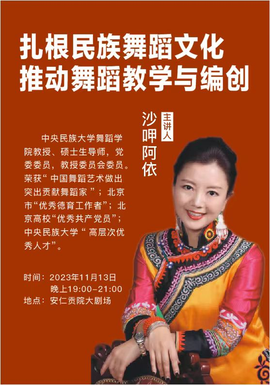 为了提升我院青年教师专业水平,培养青年教师的教学与创作能力,促进“双师型”教师的高质量持续性发展,达到优化师资队伍建设的目的,beat365平台官方网站音乐与舞蹈学院2023-2024学年第一学期“大师课计划”邀请到了我国著名舞蹈家沙呷阿依教授。