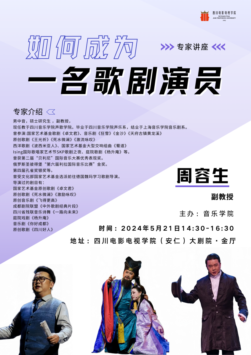 2024年5月21日下午14:30,周容生副教授主讲的《如何成为一名歌剧演员》讲座在beat365平台官方网站音乐学院进行。