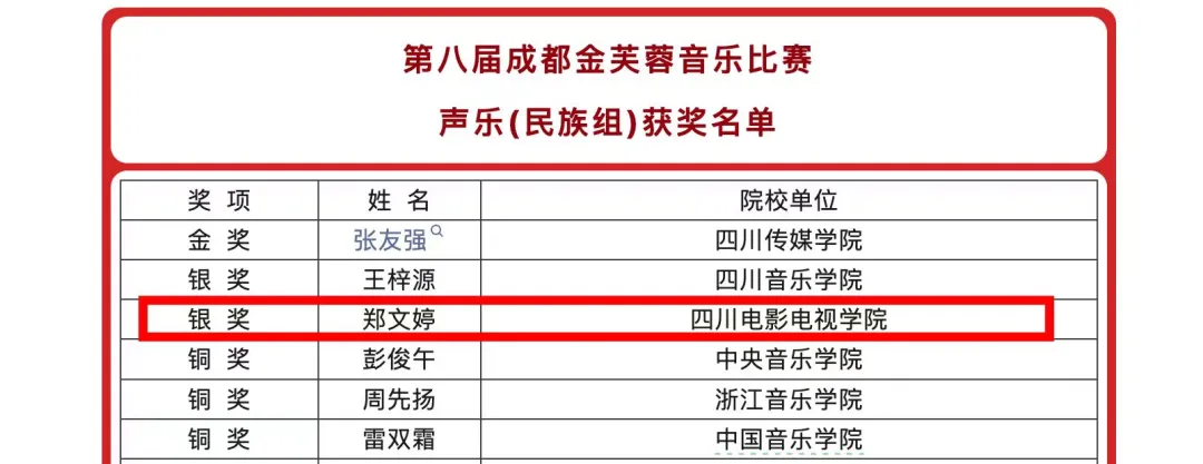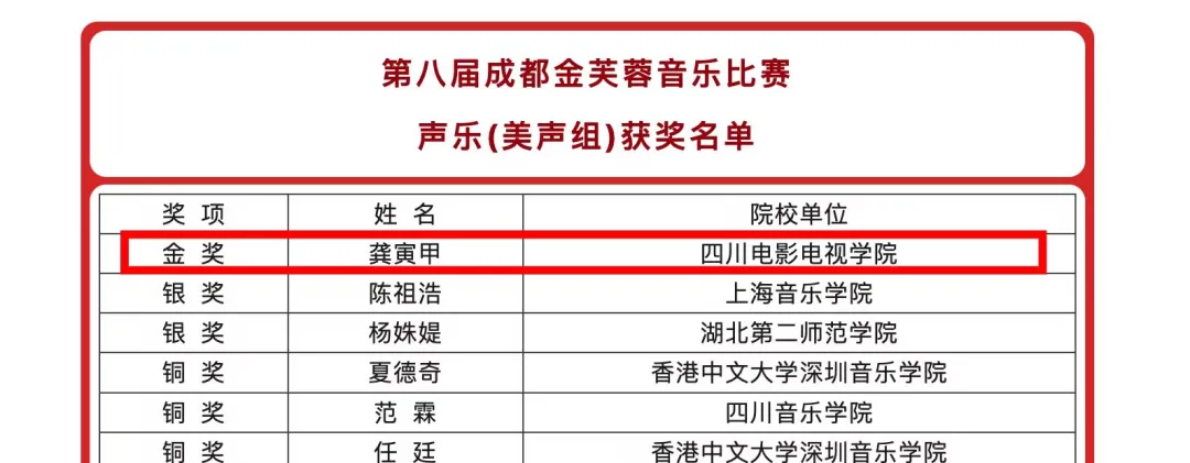 川影音乐学院青年教师龚寅甲荣获第八届成都金芙蓉音乐比赛美声(专业组)金奖,青年教师郑文婷荣获民族(专业组)银奖,青年教师吕盛可儿荣获声乐(流行组)优秀奖。