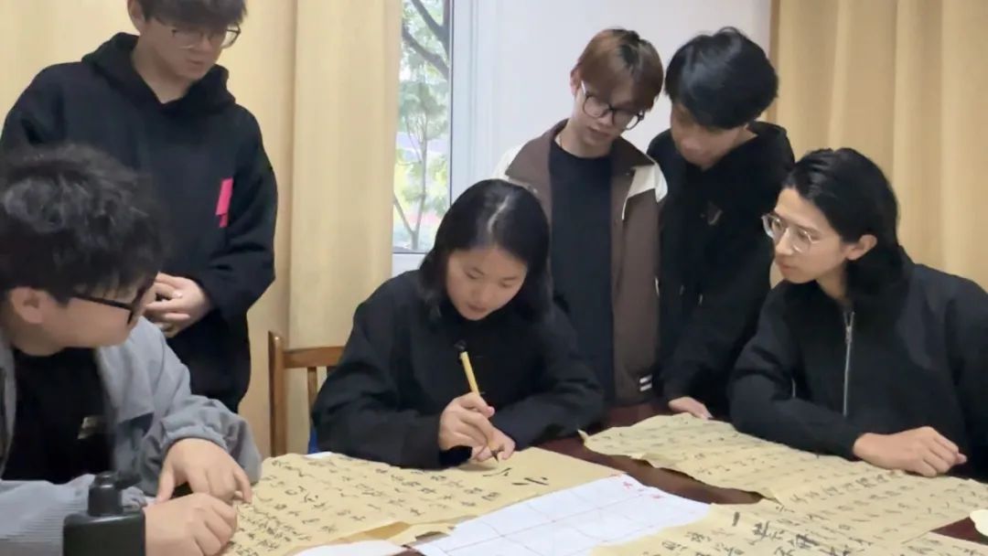 10月22日 师生们在月亮座社区围坐一团,开启了书法练习,这是音乐学院月亮座社区开展的“多元文化进社区”活动,现场气氛十分和谐融洽。