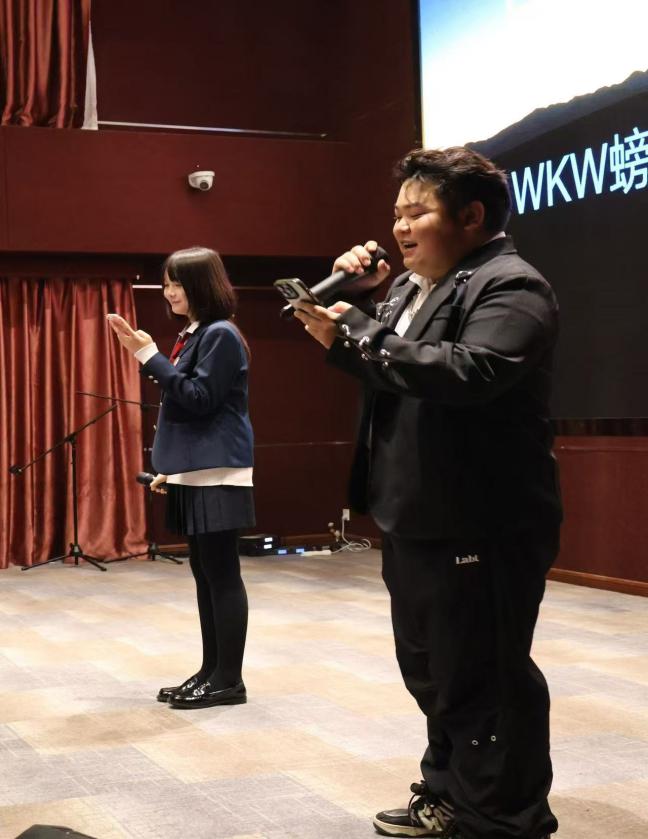 在接下来的互动游戏环节中,现场气氛迅速升温。游戏“歌词接力”要求两名同学一组,主持人说一个词语,同学们唱出带有词语的歌曲,现场充满了欢声笑语,大家的思维仿佛插上了翅膀,脑洞大开,创意无限。“大联动”抽到的同学需要发表在大学70天的感想,大家知无不言,也有很多外地同学表达在螃蟹大家庭感受到了温暖,此时,大家的心紧紧相连,仿佛一股无形的纽带将三个班级紧紧绑在一起,他们早已成为了校园里不可或缺的一家人。