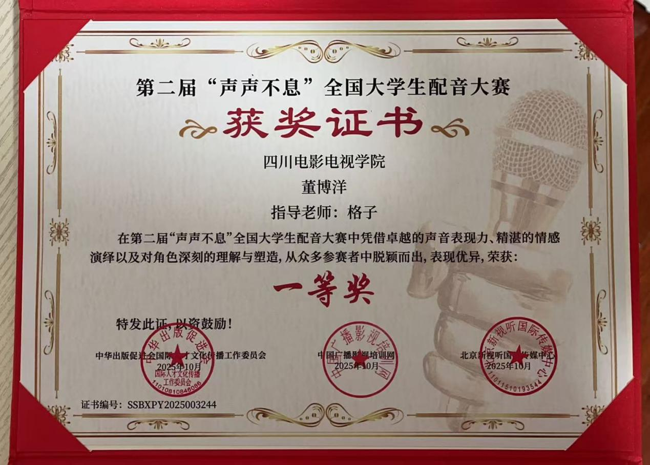 在第二届“声声不息”全国大学生配音大赛中,我校学子董博洋与搭档刘双铭合作斩获全国一等奖。参赛作品于北京“周腔扬调”专业学习期间录制,在格子老师的悉心指导下,团队对作品进行了细腻的声音设计与情感层次处理。尽管录制过程中始终感受到与原版经典的专业差距,但成员们通过反复打磨、精准捕捉人物特质,最终以充...