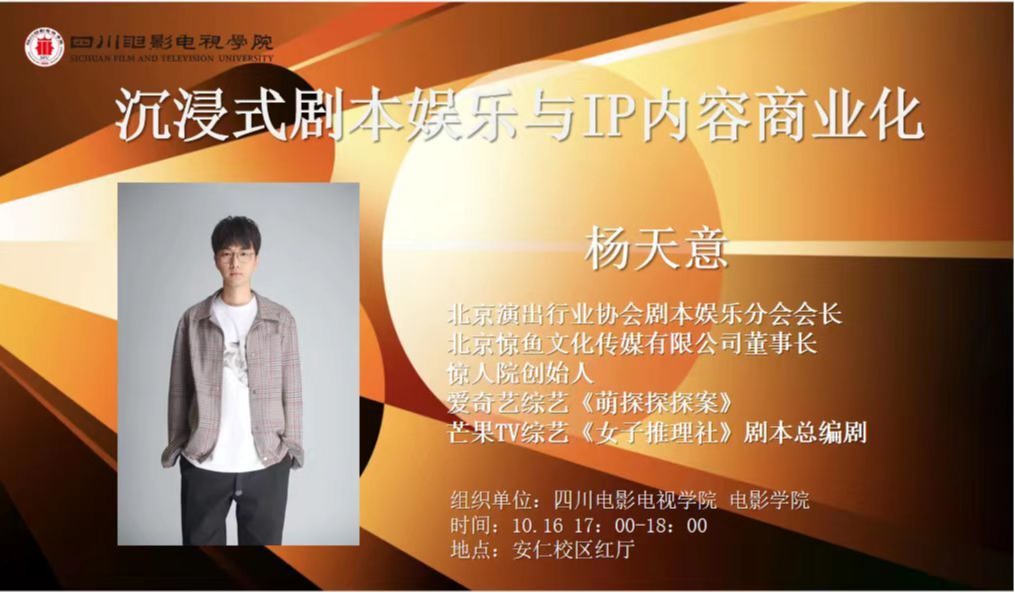 年轻人作为剧本杀行业的主力,大学生也是深度参入的人群,甚至很多学生已然参与到沉浸式文娱的产业中来。但对于行业背后的产业背景、运营机制、创作原理,大部分的同学还是知之甚少。 为此,电影学院邀请到了沉浸式剧本娱乐、“剧本杀”资深从业者,身为90后的杨天意老师,从全面的角度,为同学们答疑解惑。